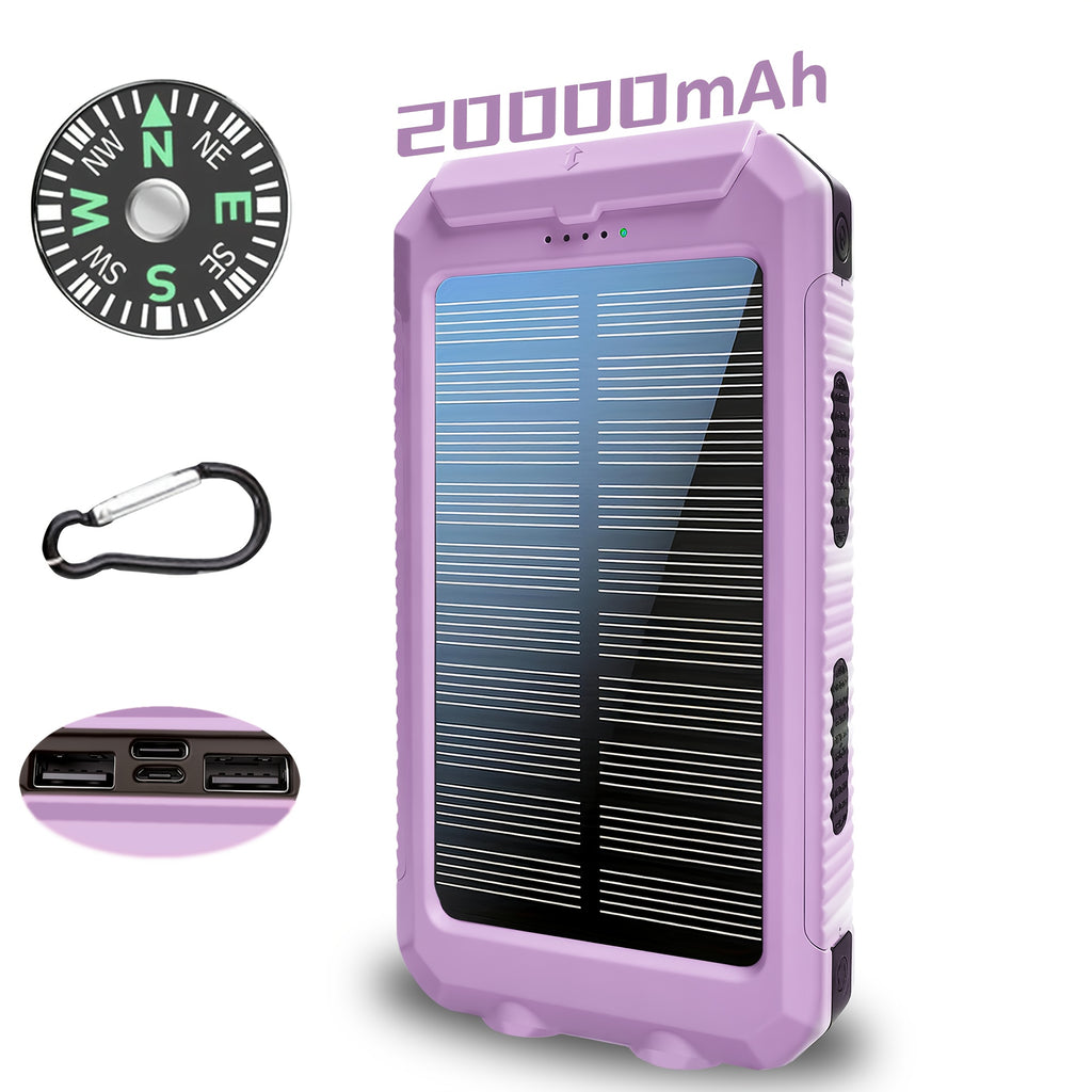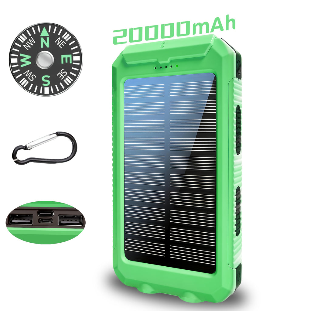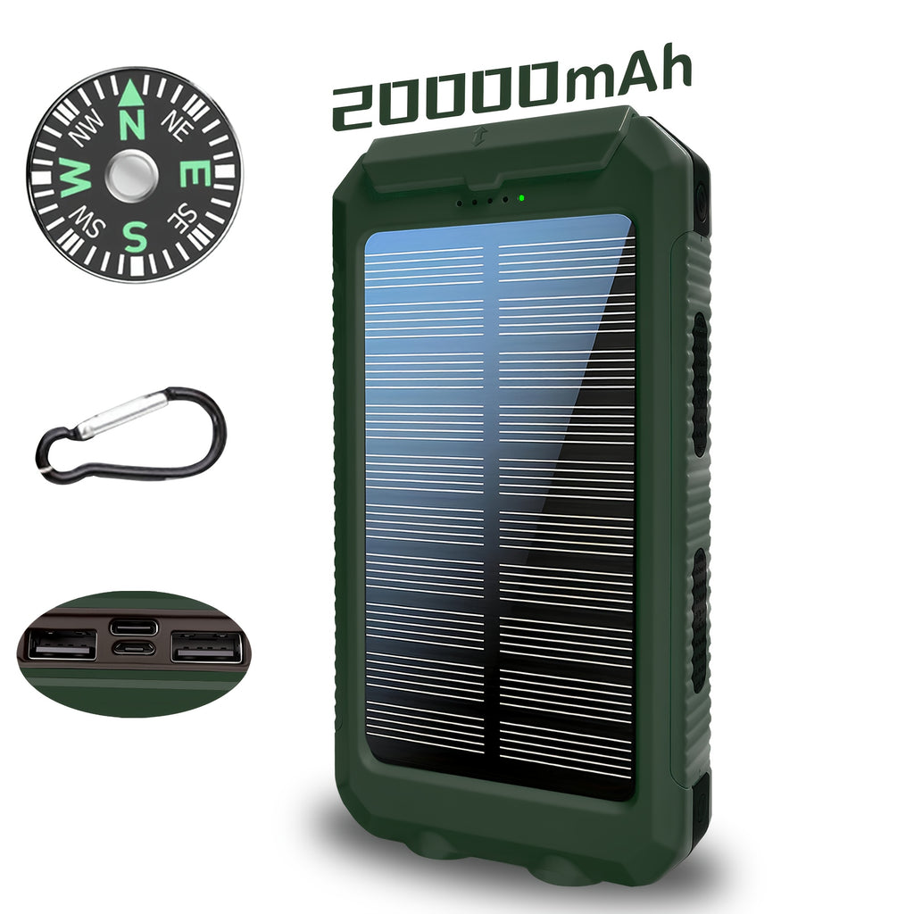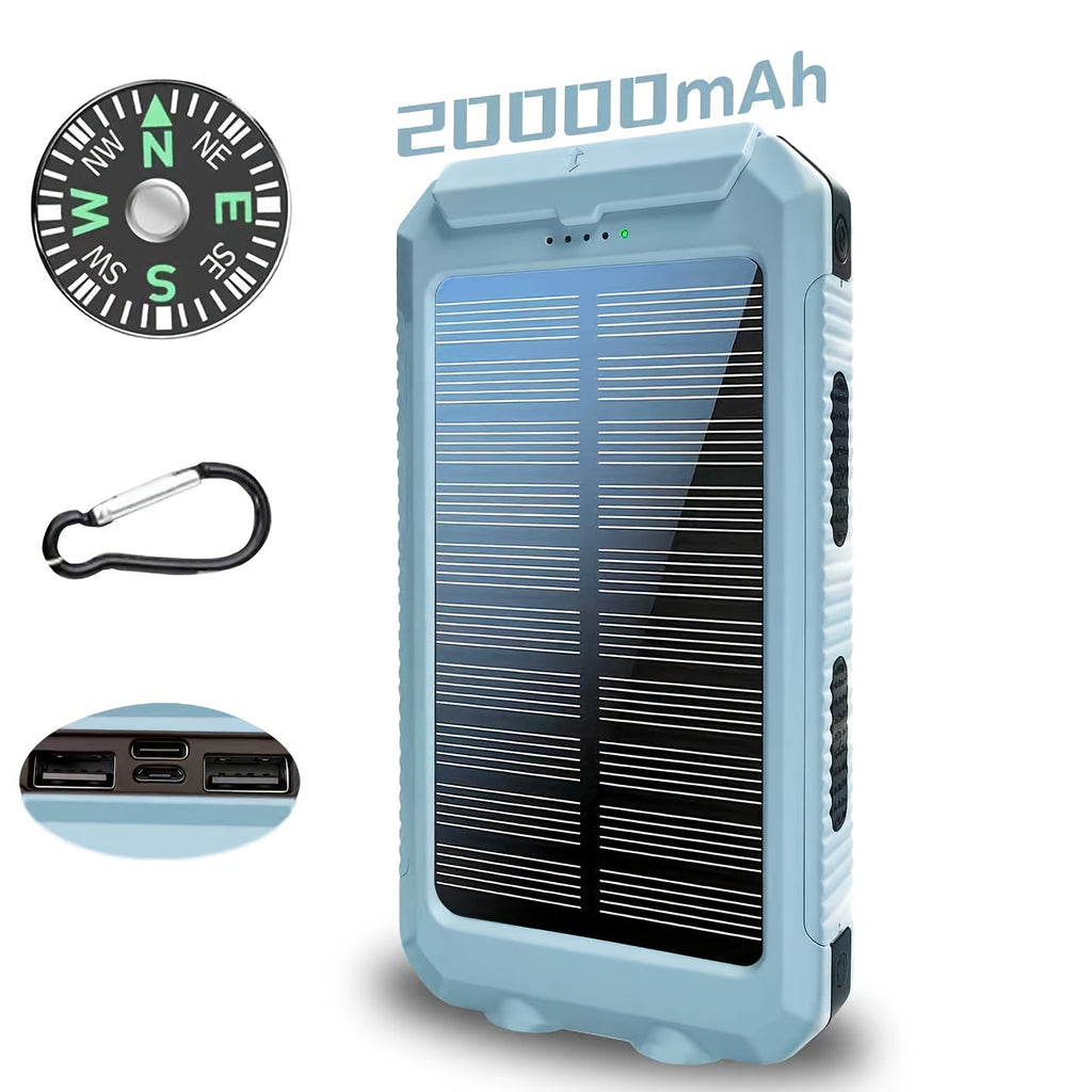 A Bateria Externa Solar Portátil 20000mAh é ideal para manter seus dispositivos carregados durante viagens, camping e atividades ao ar livre, sem depender de tomadas. Compacta, resistente e multifuncional, inclui carregamento via USB, lanternas LED e bússola integrada.